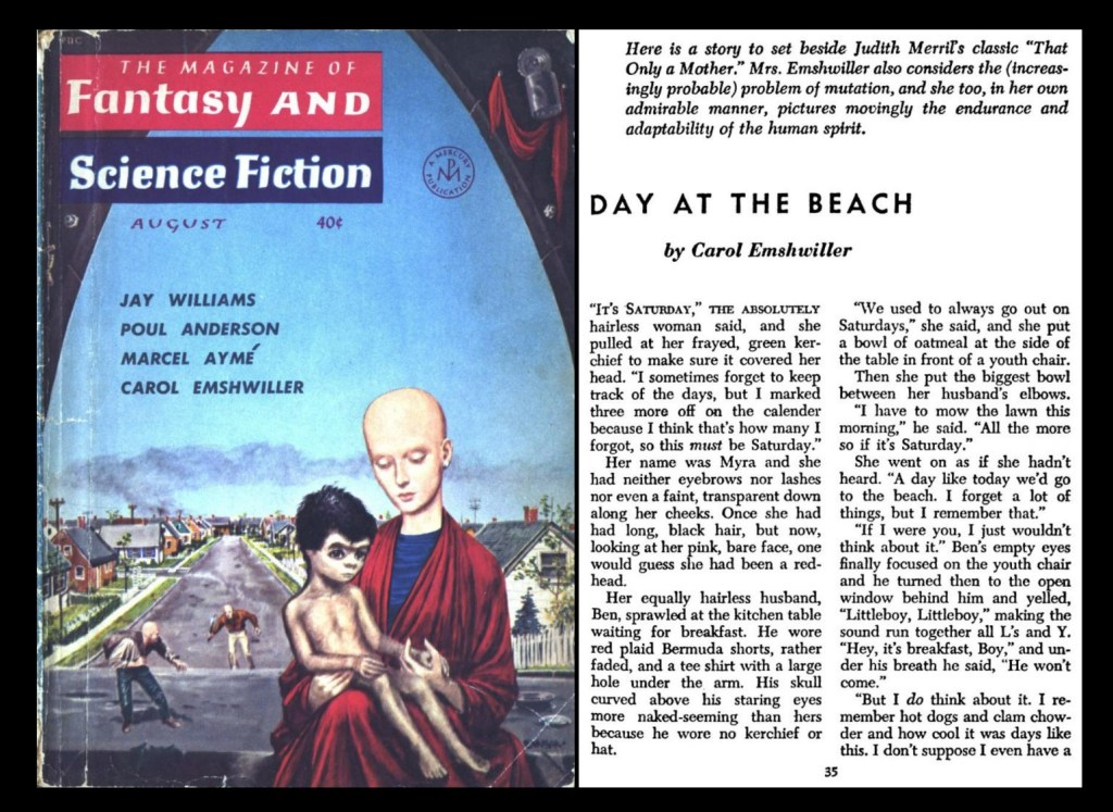 “Day at the Beach” is another story that focuses beautifully on the theme. Carol Emshwiller describes life after the bomb, living with radiation. Like many science fiction stories in the 1950s, it speculates about mutations as a consequence of radioactive fallout. Myra and her husband Ben, who are bald, take their son, Littleboy, who has lots of hair, for a day out at the beach. Littleboy is a mutant. Life is grim, but people keep on living.