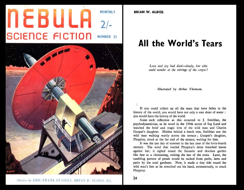 “All the World’s Tears” by Brian W. Aldiss was first published in Nebula Science Fiction 21 in 1957. It has been rarely anthologized, but frequently reprinted in collections of stories by Aldiss. Older American science fiction fans might remember reading it in Galaxies Like Grains of Sand (1960). However, that collection has been republished many times with varying numbers of stories. I don’t recommend the current Kindle edition because it leaves off the story titles, uses the theme titles instead, and runs the intros into the beginnings of the stories. It’s readable but annoying.