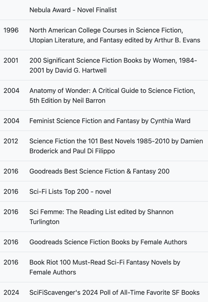 Parable of the Sower is on the Classics of Science Fiction List because of these 12 citations: