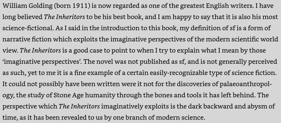 I read The Inheritors by William Golding because I’m reading or rereading the classics of science fiction. I’m going through David Pringle’s Science Fiction: The 100 Best Novels. The Kindle edition of the Pringle book is $1.99. The Kindle edition of The Inheritors is just 99 cents. You can read a list of Pringle’s 100 recommended SF titles here.