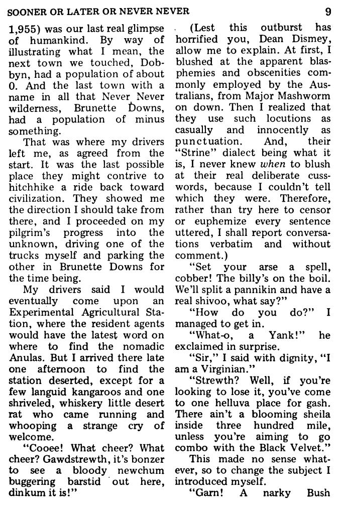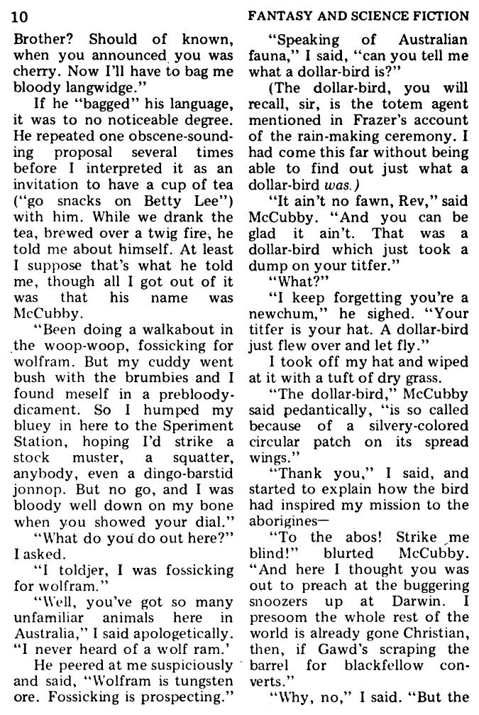 “Sooner or Later or Never Never” is told as a letter to The Rev. Orville Dismey, Dean of Missionary Vocations, at the Southern Primitive Protestant Seminary in Grobian, Virginia. Crispin Mobey narrates his effort to bring Christ to the Anula tribe in the Australian outback. Mobey was inspired by a quote from The Golden Bough by Sir James Frazer. The quote describes a ritual Frazer witnessed. Mobey wants to use that ritual to bring Christianity to a rather primitive tribe.