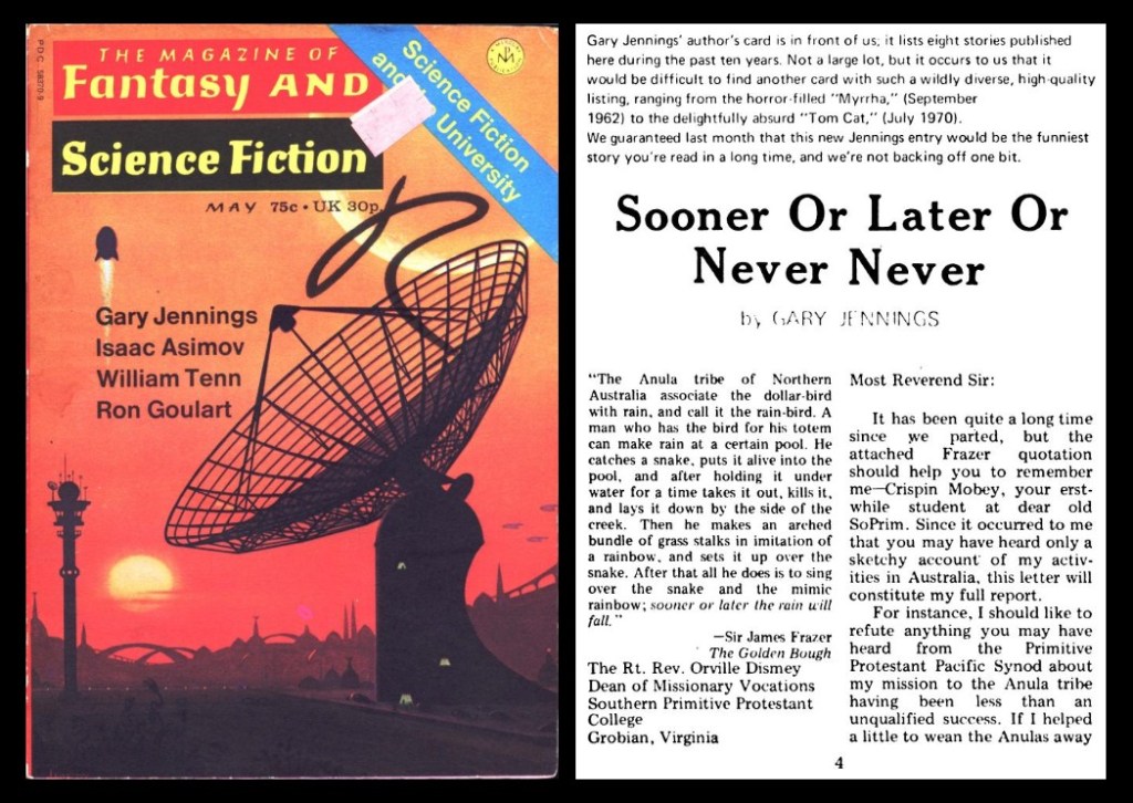 What exactly is fantasy? “Sooner Or Later Or Never Never” by Gary Jennings has no magic, no fantastic creatures. Its setting is present-day Australia. The story is both comic and absurd. Yet, it’s based on a somewhat realistic premise. Yes, the characters and plot are made up, but so is most fiction. I can find no reason to call this a fantasy. I assume Edward L. Ferman published it in the May 1972 issue of The Magazine of Fantasy & Science Fiction because he admired the creative prose — and he had the power to publish it.