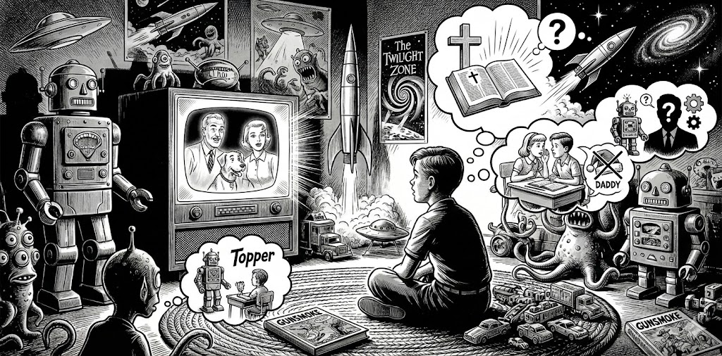 From ages 0-5 (1951-56), I don’t remember television, books, or magazines. My cognitive awareness was limited to my parents, sister, and grandmother. I can only recall a few conversations, and I was struggling with some very limited ideas. My vocabulary was small, and I comprehended few abstractions. However, if I had perfect recall, I bet I heard people talk about rockets, space travel, aliens from outer space, and robots. I’m not sure about time travel.