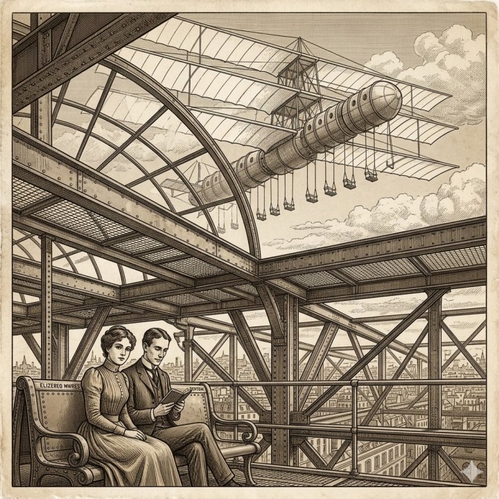And meanwhile “Elizebeθ Mwres,” as she spelt her name, or “Elizabeth Morris” as a nineteenth-century person would have put it, was sitting in a quiet waiting-place beneath the great stage upon which the flying-machine from Paris descended. And beside her sat her slender, handsome lover reading her the poem he had written that morning while on duty upon the stage.