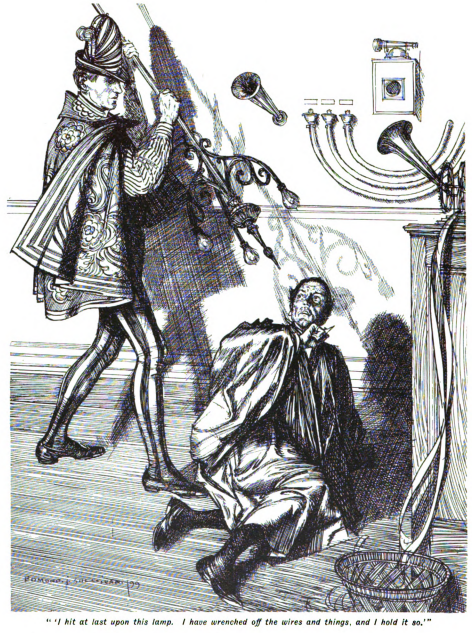 “I looked about for a weapon also. It is an astonishing thing how few weapons there are nowadays. If you consider that in the Stone Age men owned scarcely anything but weapons. I hit at last upon this lamp. I have wrenched off the wires and things, and I hold it so.” He extended it over the hypnotist’s shoulders. “With that I can quite easily smash your skull. I will—unless you do as I tell you.”