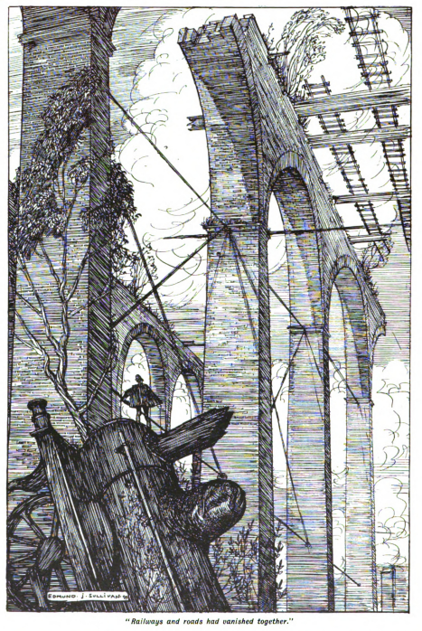 The introduction of railways was only the first step in that development of those means of locomotion which finally revolutionised human life. By the year 2000 railways and roads had vanished together. The railways, robbed of their rails, had become weedy ridges and ditches upon the face of the world; the old roads, strange barbaric tracks of flint and soil, hammered by hand or rolled by rough iron rollers, strewn with miscellaneous filth, and cut by iron hoofs and wheels into ruts and puddles often many inches deep, had been replaced by patent tracks made of a substance called Eadhamite. This Eadhamite—it was named after its patentee—ranks with the invention of printing and steam as one of the epoch-making discoveries of the world’s history.