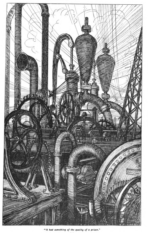 Presently it was time for them to part, and each went to the appointed work. Denton’s was to mind a complicated hydraulic press that seemed almost an intelligent thing. This press worked by the sea-water that was destined finally to flush the city drains—for the world had long since abandoned the folly of pouring drinkable water into its sewers. This water was brought close to the eastward edge of the city by a huge canal, and then raised by an enormous battery of pumps into reservoirs at a level of four hundred feet above the sea, from which it spread by a billion arterial branches over the city. Thence it poured down, cleansing, sluicing, working machinery of all sorts, through an infinite variety of capillary channels into the great drains, the cloacae maximae, and so carried the sewage out to the agricultural areas that surrounded London on every side.
