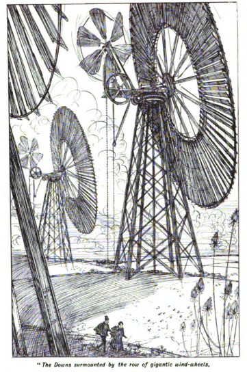 Before them in the south rose the Downs, blue at first, and as they came nearer changing to green, surmounted by the row of gigantic wind-wheels that supplemented the wind-wheels upon the roof-spaces of the city, and broken and restless with the long morning shadows of those whirling vanes. By midday they had come so near that they could see here and there little patches of pallid dots—the sheep the Meat Department of the Food Company owned. In another hour they had passed the clay and the root crops and the single fence that hedged them in, and the prohibition against trespass no longer held: the levelled roadway plunged into a cutting with all its traffic, and they could leave it and walk over the greensward and up the open hillside.