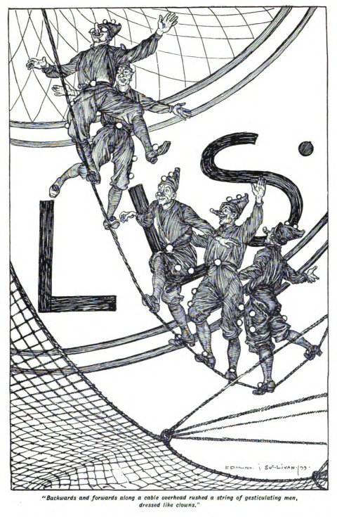 Elizabeth’s eyes sought a resting-place and found none. To the right roared the eastward ways, to the left the ways in the opposite direction, swarming with people. Backwards and forwards along a cable overhead rushed a string of gesticulating men, dressed like clowns, each marked on back and chest with one gigantic letter, so that altogether they spelt out: