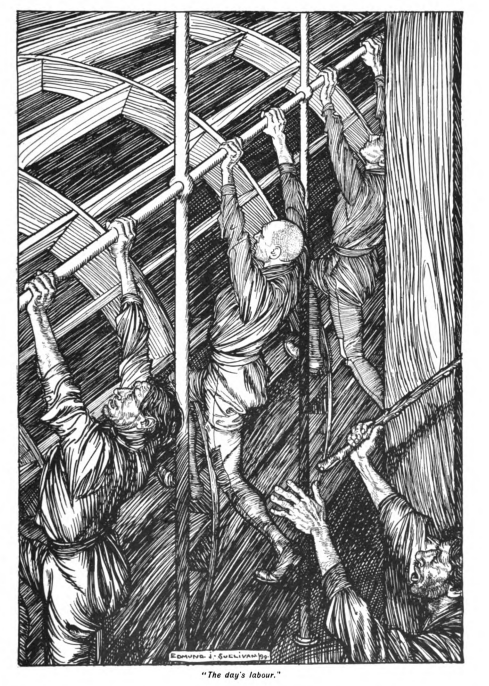 Their ways to their work lay together for a time. And now they found they could talk. Curiously enough, the worst of their depression seemed over now that they had actually donned the blue. Denton could talk with interest even of the work that lay before them. “Whatever it is,” he said, “it can’t be so hateful as that hat shop. And after we have paid for Dings, we shall still have a whole penny a day between us even now. Afterwards—we may improve,—get more money.”