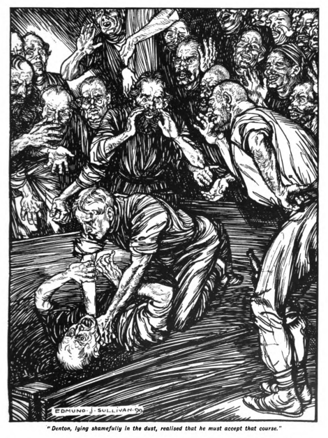 “Scrap, boys!” shouted some one, and then the dark figure had leapt forward, ducked back and sideways, and come in again. Denton struck out, and was hit. One of his eyes seemed to him to be demolished, and he felt a soft lip under his fist just before he was hit again—this time under the chin. A huge fan of fiery needles shot open. He had a momentary persuasion that his head was knocked to pieces, and then something hit his head and back from behind, and the fight became an uninteresting, an impersonal thing.