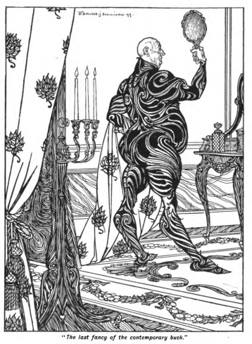 At times he would distend himself with pneumatic vestments in the rococo vein. From among the billowy developments of this style, and beneath a translucent and illuminated headdress, his eye watched jealously for the respect of the less fashionable world. At other times he emphasised his elegant slenderness in close-fitting garments of black satin. For effects of dignity he would assume broad pneumatic shoulders, from which hung a robe of carefully arranged folds of China silk, and a classical Bindon in pink tights was also a transient phenomenon in the eternal pageant of Destiny. In the days when he hoped to marry Elizabeth, he sought to impress and charm her, and at the same time to take off something of his burthen of forty years, by wearing the last fancy of the contemporary buck, a costume of elastic material with distensible warts and horns, changing in colour as he walked, by an ingenious arrangement of versatile chromatophores. And no doubt, if Elizabeth’s affection had not been already engaged by the worthless Denton, and if her tastes had not had that odd bias for old-fashioned ways, this extremely chic conception would have ravished her. Bindon had consulted Elizabeth’s father before presenting himself in this garb—he was one of those men who always invite criticism of their costume—and Mwres had pronounced him all that the heart of woman could desire. But the affair of the hypnotist proved that his knowledge of the heart of woman was incomplete.