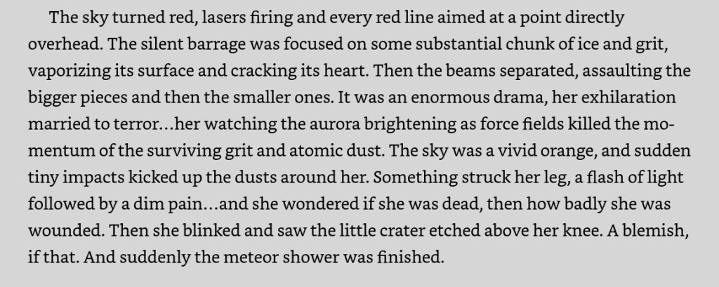 And to make his story even more fun, he takes us through several plot twists. There is a scene when Quee Lee is on the surface of the ship describing a tremendous light show of lasers destroying comets before they could hit the ship that reminded me of the “Tears in the Rain” speech by Roy Batty in Blade Runner. It goes like this: “I’ve seen things you people wouldn’t believe… Attack ships on fire off the shoulder of Orion… I watched C-beams glitter in the dark near the Tannhäuser Gate. All those moments will be lost in time, like tears in rain… Time to die.”