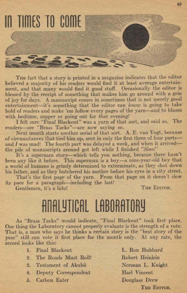 The World Beyond the Hill by Alexei and Cory Panshin and Astounding Alec Nevala-Lee were two huge histories of science fiction in the 1940s. Both books focused on the magazine Astounding Science-Fiction, where John W. Cambell was a genre-shaping editor. The Panshins concentrated on three writers: Heinlein, Asimov, and van Vogt, while Nevala-Lee dwelt on Heinlein, Asimov, and L. Ron Hubbard. The Panshins volumes were more about the stories, with some biographical details. Nevala-Lee spent more words on the biographies of the four men, with less prose about their stories. Combined, the two volumes make a great overview of Astounding Science-Fiction in the 1940s.