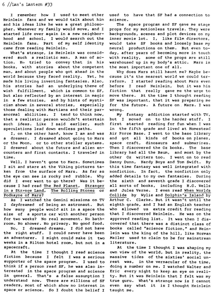 From reading all the biographies of Heinlein, and his work, I get the feeling he was deeply dissatisfied with our society and was burning to reshape it. Many of the lectures/infodumps deal with customs and beliefs that were common in the 1940s and are still embraced today. I think Heinlein resented the thinking behind them as impediments to his freedom. By the time I started reading Heinlein in 1964, when I was twelve, I had already decided to become an atheist. Maybe I felt a kinship with Heinlein’s quest to be mentally free. But I grew up in the sixties when youthful rebellion was required. We were way beyond Heinlein regarding free thinking.