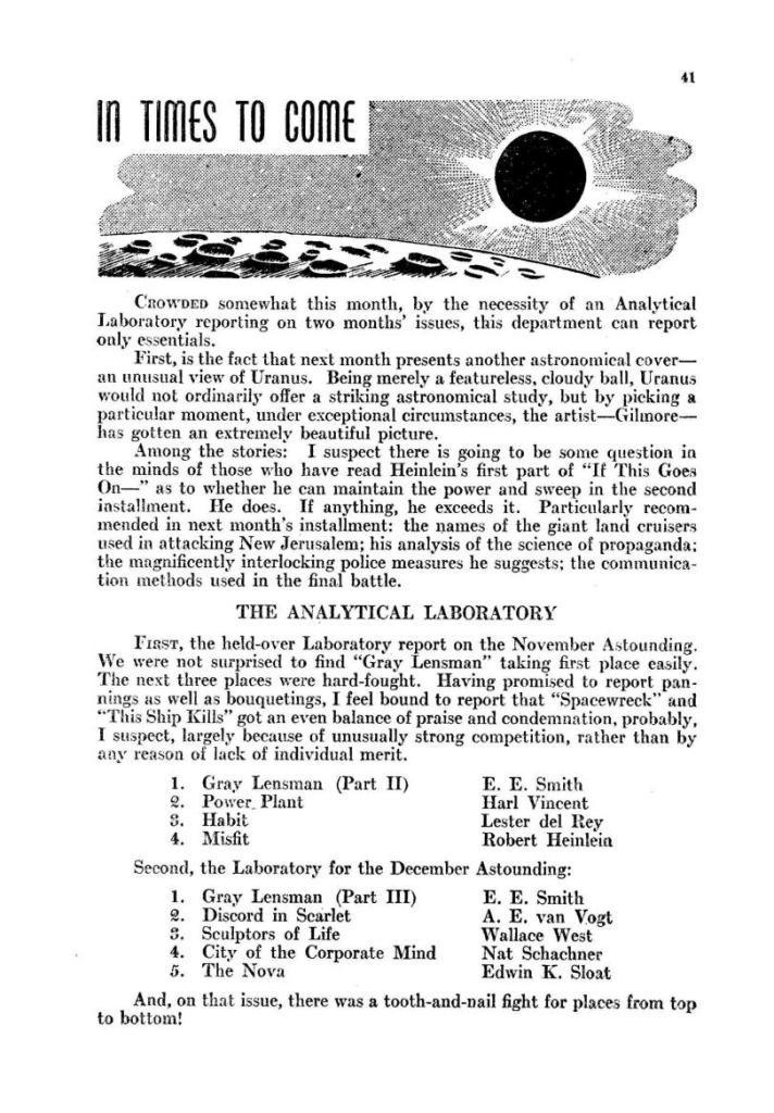 During 1938, Heinlein started casting around for work and, cushioned by that military pension, decided to try fiction. His first attempt, For Us, the Living, was an Edward Bellamyesque utopia, loosely plotted and heavy on the lectures, which never reached the public during his lifetime. However, for the rest of his life he would mine this unpublished manuscript for ideas, so that we can see the working and reworking of the thoughts of the young Heinlein using the skill and critical eye (and sometimes mature cynicism) of the older Heinlein. While it did the rounds of publishers Heinlein embarked on his first venture into the pulp magazines.