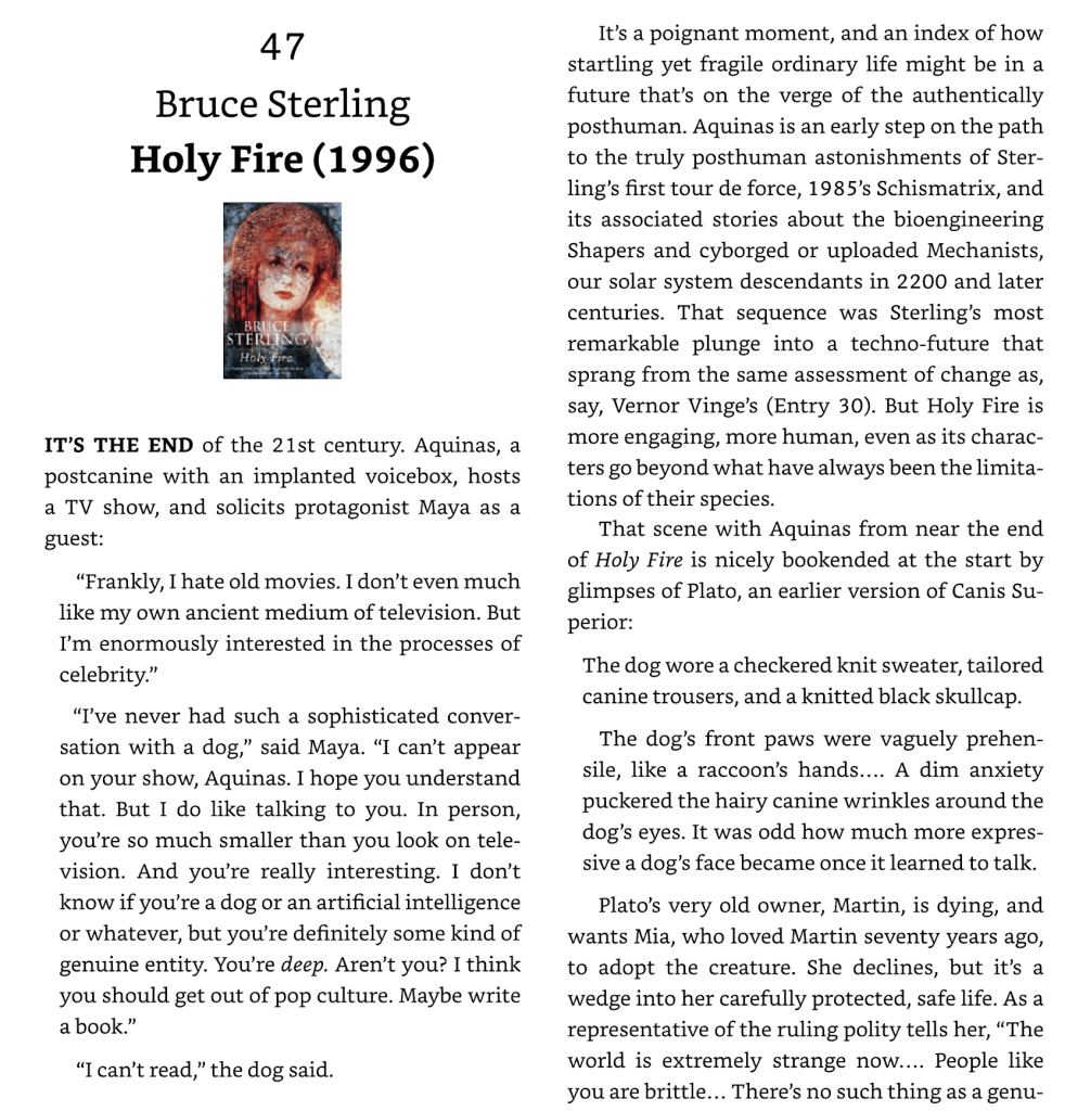 Science fiction writers can’t predict the future but some aim to speculate on times to come by extrapolating current trends. One of the most famous SF novels to do this was Stand on Zanzibar by John Brunner, his 1968 novel that anticipated the world of 2010. Bruce Sterling’s 1996 novel Holy Fire tries to imagine life in 2096 via speculation and extrapolation. Do I recommend it? That’s hard to say, even at the current Kindle price of $1.99.