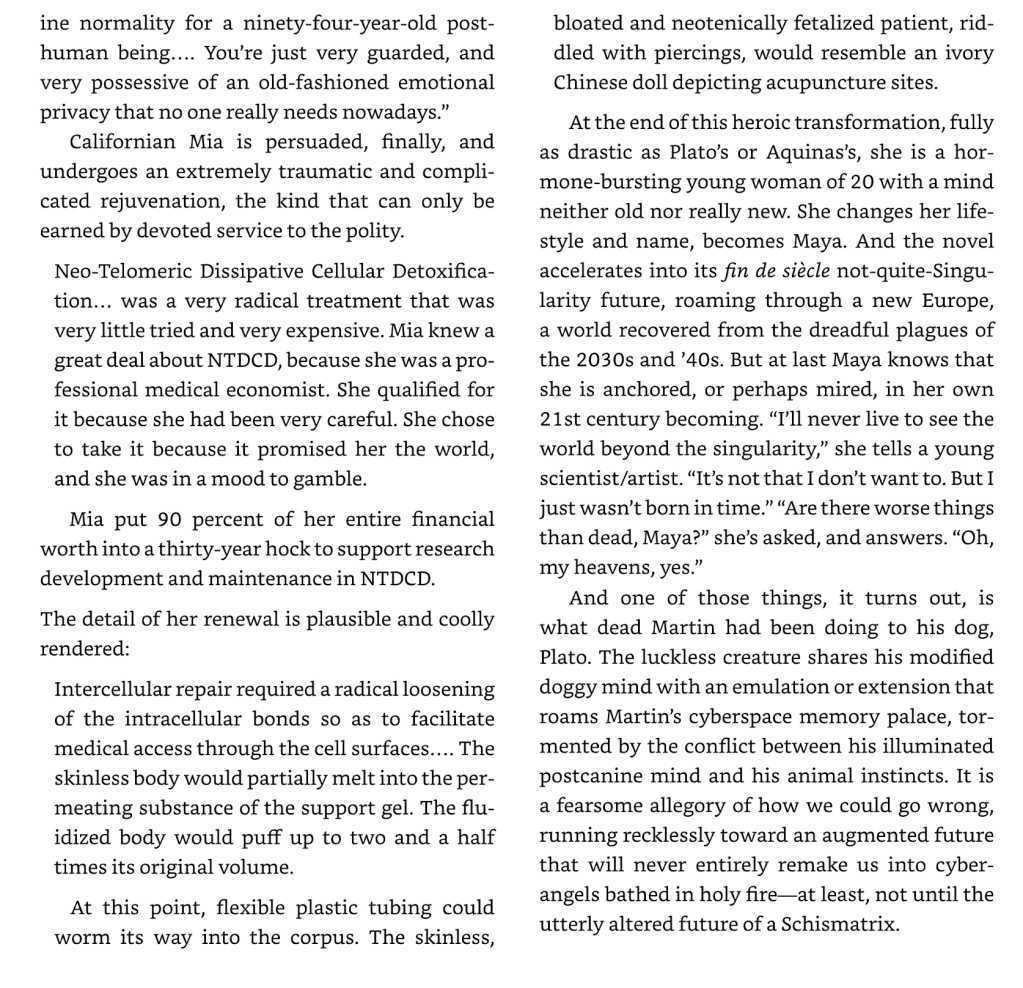 Sterling calls Mia/Maya and others in this book posthumans, and that’s where this story shines. His posthumans aren’t silly comic-book superheroes like in many 21st-century SF books. Virtual reality is toned down too from 21st-century SF stories of people downloading themselves into virtual realities. Sterling tries to stay reasonably realistic and scientific. Holy Fire reminds me of the dense speculation in John Brunner’s Stand on Zanzibar. Sterling doesn’t take it to narrative gonzo extremes like Brunner.