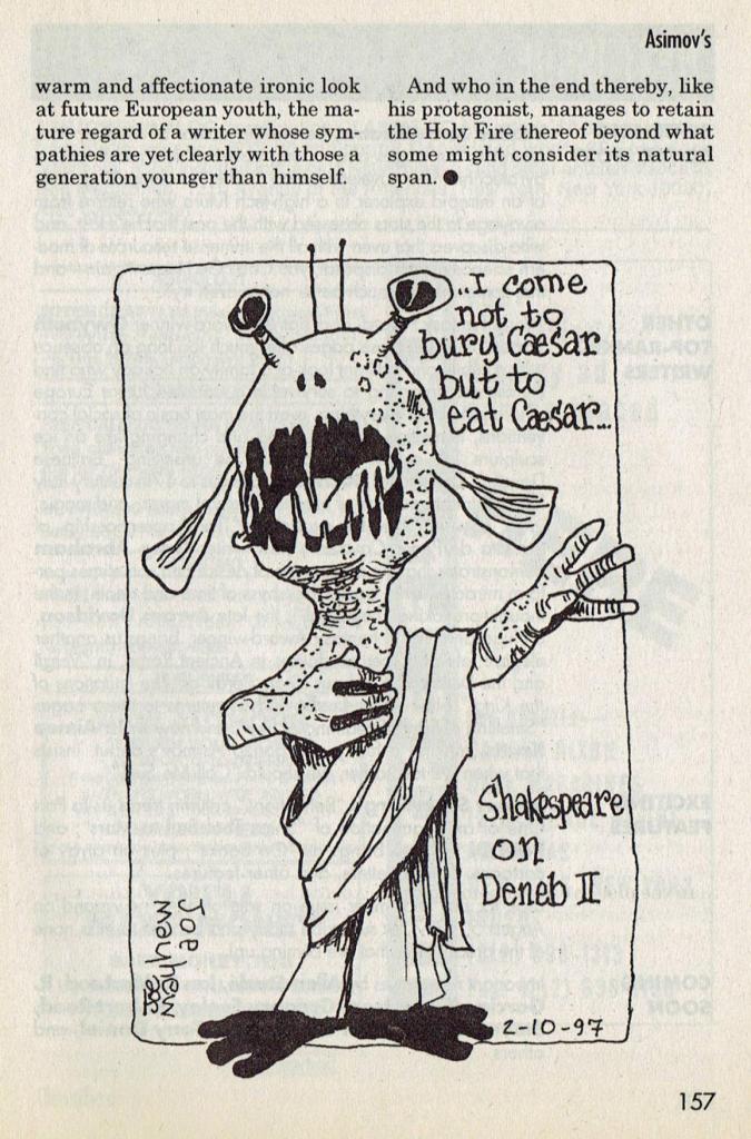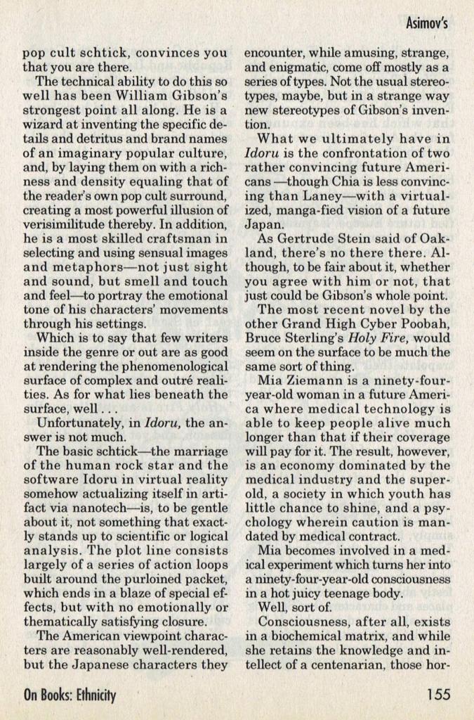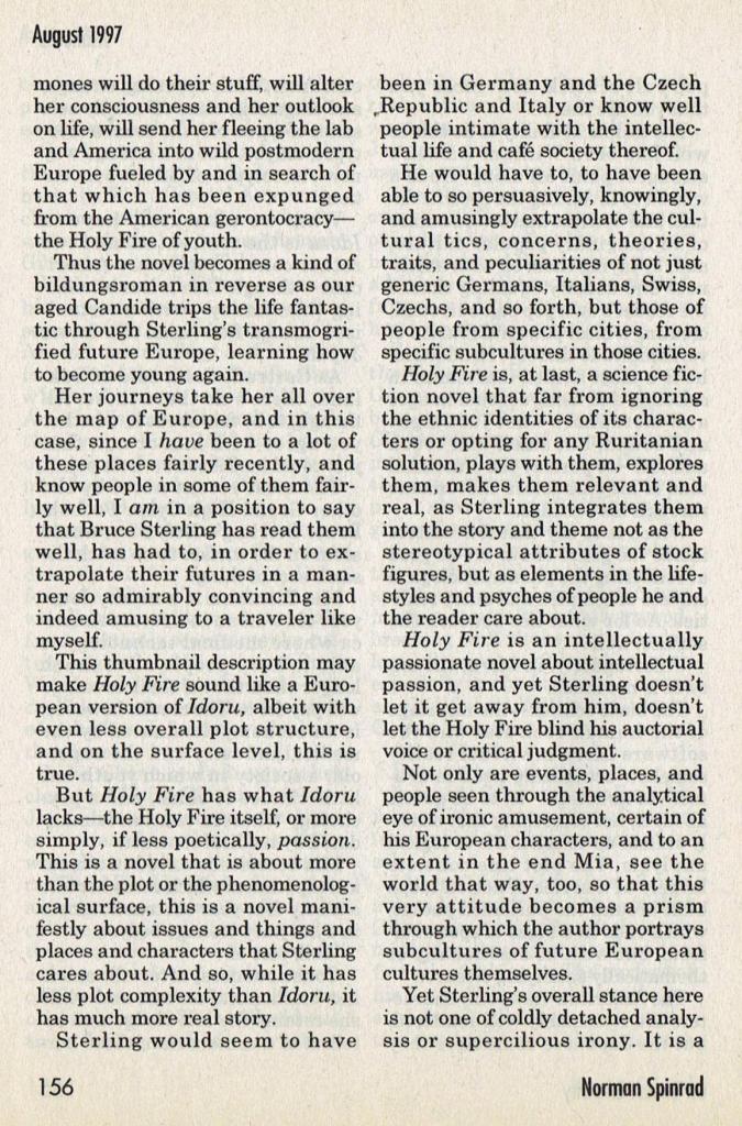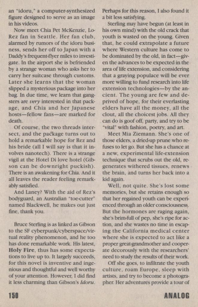 Norman Spinrad’s “On Books” from the August 1997 issue of Asimov’s Science Fiction also compares Holy Fire to William Gibson’s Idoru but comes to a different conclusion. Both novels are later cyberpunk works from the two leading founders of the cyberpunk movement, so it was logical to review them together. Spinrad is the more insightful of the two reviewers.