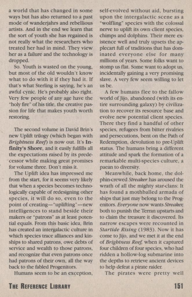 Reviews were also mixed. Tom Easton in “The Reference Library” for the March 1997 issue of Analog has this to say: