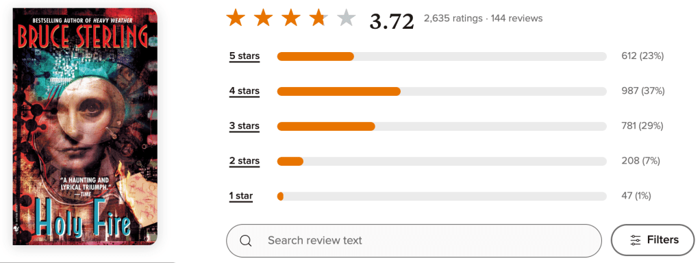 How self-aware are you regarding the selection of the science fiction you read? Does your mind crave a tightly plotted story? If so, Holy Fire by Bruce Sterling might not be for you. Or do you love reading novels with characters you care about, even identify with, and want to vicariously live their fictional adventures? Again, Holy Fire might not be your cup of tea. If you are the kind of science fiction reader who resonates with dense science fiction speculation, reading Holy Fire should definitely be for you.