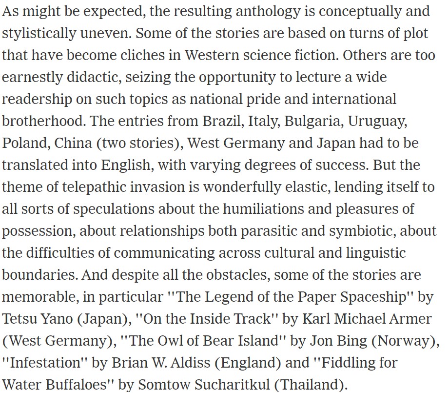 “The Valley of Echoes” by Gérard Klein is story #11 of 52 from the anthology The World Treasury of Science Fiction edited by David G. Hartwell (1989) that my short story club is group reading. Stories are discussed on Tuesdays, Thursdays, and Saturdays. “The Valley of Echoes” was originally published in France as “La vallée des échos” in the magazine Satellite in March 1959, and was first translated into English for the anthology View From Another Shore edited by Franz Rottensteiner. It was also reprinted in The Road to Science Fiction, Volume 6: Around the World edited by James Gunn.