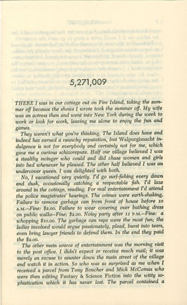 This time when I read “5,271,009” I had an introduction by Bester to give me more clues. This copy is from Starlight: The Great Short Fiction of Alfred Bester which reprints a 2-volume collection from 1976.