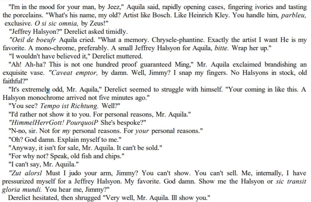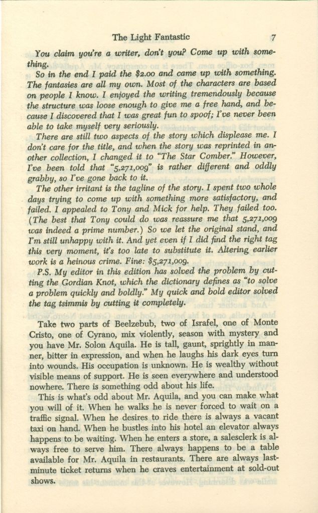 Actually, I wonder in “5,271,009” if Alfred Bester isn’t doing something like William Shanter did in the famous “Get a Life” skit on SNL. In the story, Mr. Solon Aquila is described as being two parts Beelzebub, two of Israfel, one of Monte Cristo, one of Cyrano, and mix violently. I believe Mr. Solon Aquila is Bester, Jeffrey Halsyon is either the science fiction genre, or the stand-in for all science fiction fans, or both. Just to give you a taste of Bester’s prose and the sound of Aquila: