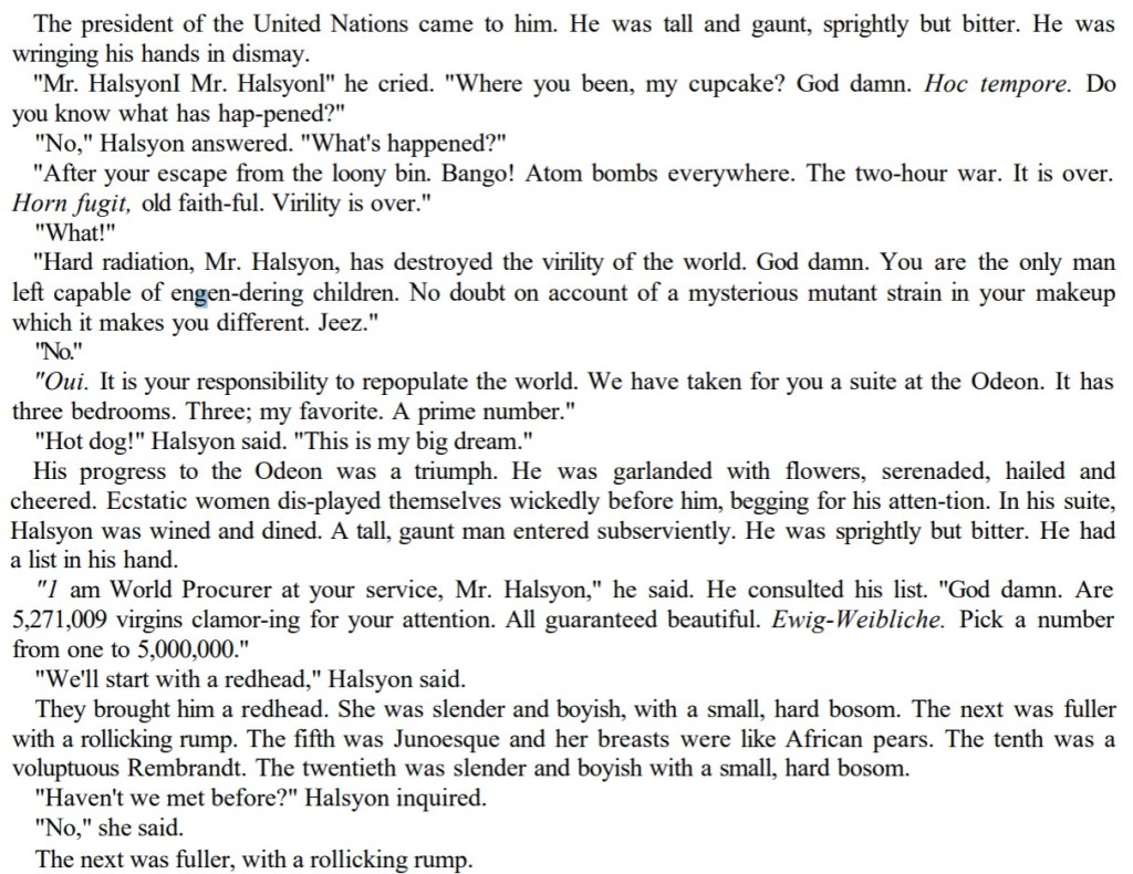 Aquila drugs Halsyon and puts him through a series of hallucinations where Halsyon plays out adolescent fantasies often found in science fiction stories, and the number 5,271,009 shows up again and again in these fantasies. The first is a sex fantasy: