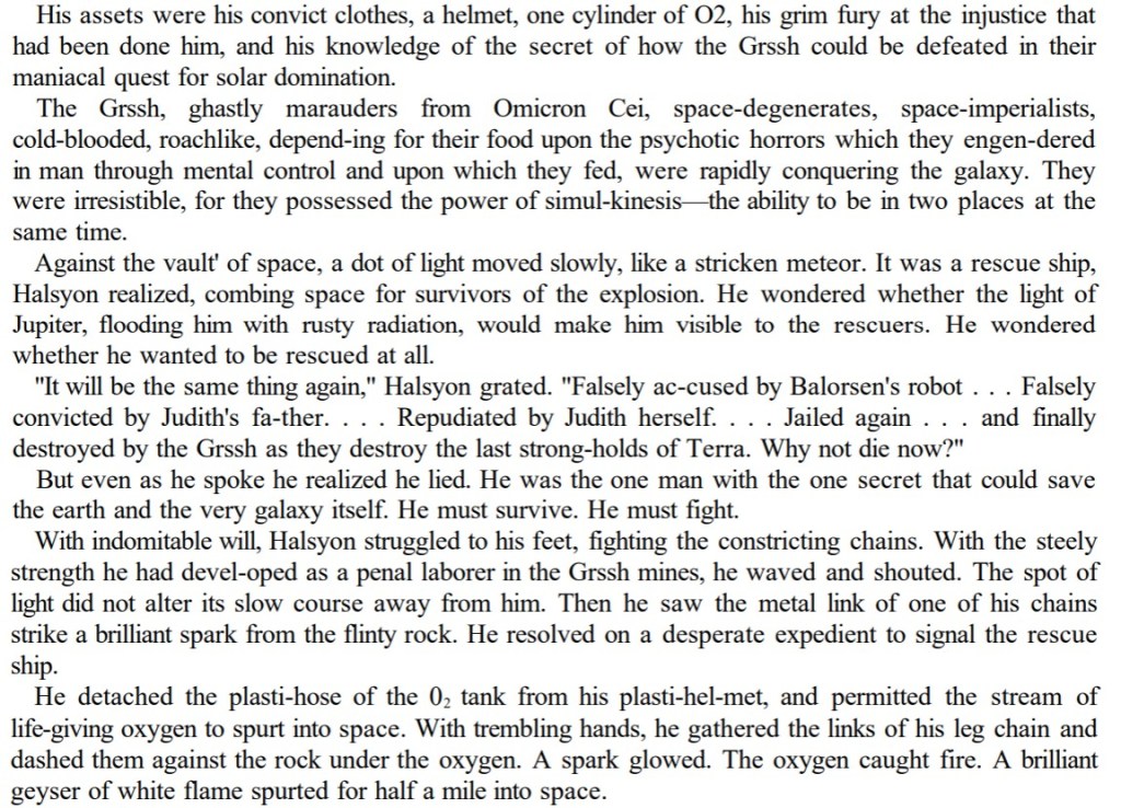 Now, look at a similar page from “Fondly Fahrenheit.” This is actually one of the slower sections of the story, yet murder and a change of planets happen on this Kindle page. But also, Bester tells more about the characters and moves the story along better with each sentence.
