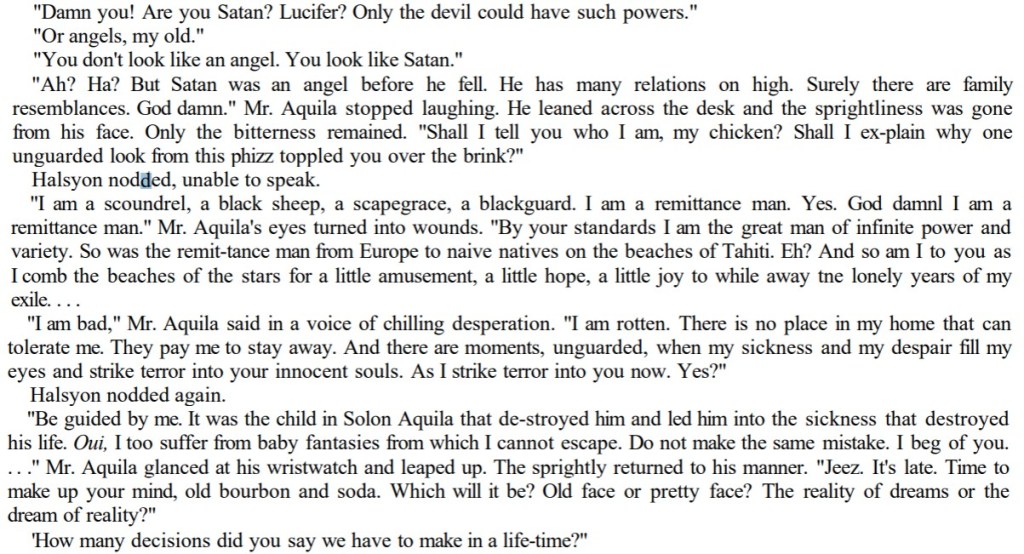 It’s interesting that Solon Aquila takes on the job of curing Jeffrey Halsyon. And doesn’t the name Halsyon sound like halcyon? One definition of halcyon is “Often used to describe an idyllic time in the past that is remembered as better than today.” Another confession, that’s exactly how I look back on old science fiction.