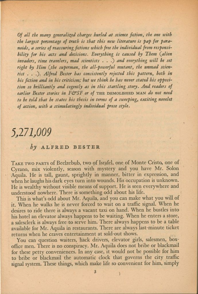 Now, I’m not sure if Boucher and McComas aren’t misleading us, or misreading Bester’s story. I’ve never considered science fiction “pap for paranoids,” or that it’s read by people seeking stories that will free them from their responsibilities. “5,271,009” is one wild ride that begs to be explained.