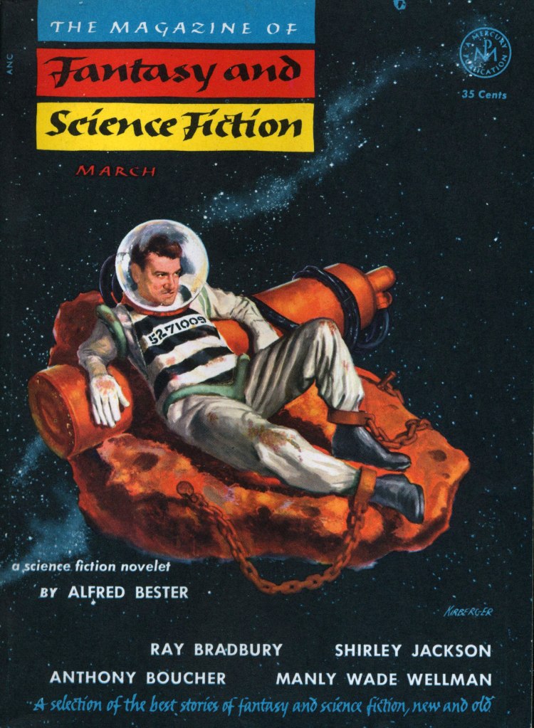 We learn that “5,271,009” was written on assignment to fictionalize the cover artwork. Bester thought the art was obvious camp, and at first didn’t want to take on the project. He felt the story would have to be mad camp. I’ve been seeing that cover since the 1970s and I’ve never once considered it mad camp. Have you? I love the covers on F&SF, especially the ones from the 1950s. If I had to describe what was happening on the cover, I would say a convict was left to die out in space and given enough air to make it torture. But then, that might be exactly what Bester is making fun of.