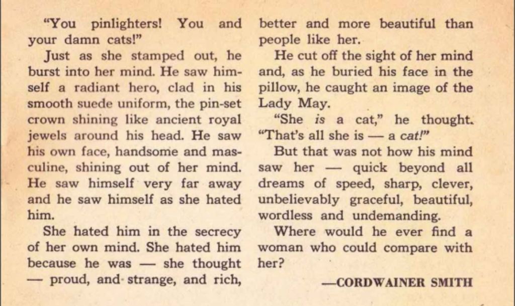 Each time I forget why I love this story, but whenever I start rereading all the details I admired comes back to me. Cordwainer Smith has created a delicious tale for people who love cats and space travel, and I’m his perfect target audience.