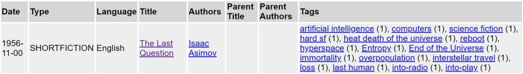 “The Last Question” is stuffed full of science fictional ideas and has often been dramatically presented at planetarium shows. At ISFDB.org the story is also listed with quite a few topic tags for such a short story. Unfortunately, the tag system hasn’t been widely implemented yet. I’d love to know all the other SF stories that deal with “reboot” and “heat death of the universe.” I know Tau Zero by Poul Anderson was a reboot story, but it has a different topic tag for that concept – “big crunch.”